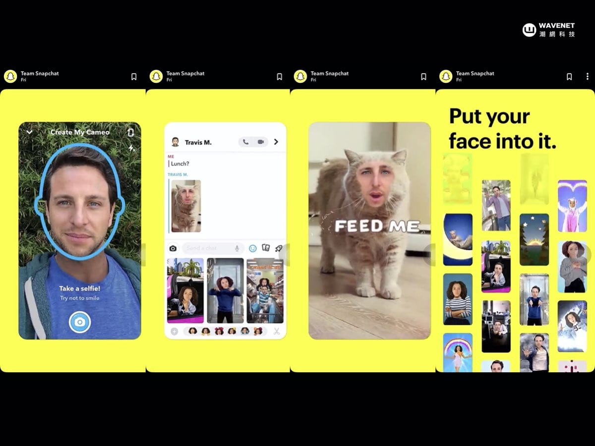 繼上次熱烈討論的爆紅返老還童濾鏡後,Snapchat 近期推出 Cameo GIF 濾鏡功能,讓用戶拍攝臉部並套用至150種各式各樣的趣味 GIF 圖檔中,每種濾鏡搭配不同主題及表情,臉部變化也做得非常細緻。另外,Snapchat 未來也可能每週發布新的音效來提供用戶選擇,除了在 Snapchat 上使用外,也能匯出轉發至其他社群媒體。現在就開始惡搞朋友的臉吧!