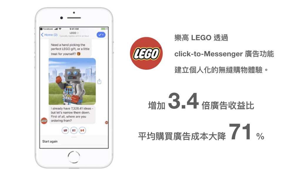 (樂高利用 click-to-Messenger 廣告功能建立個人化的無縫購物體驗。資料來源:Facebook Success Stories, EMEA, February 2018)