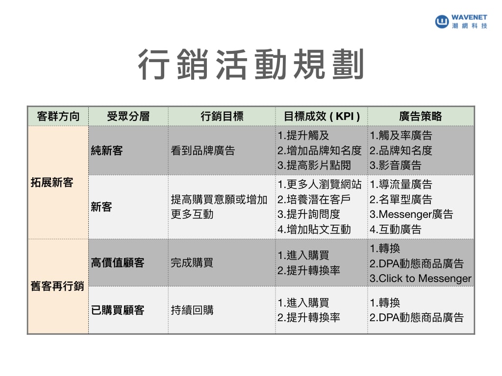 一切準備就緒之後,到了最後一步規劃廣告方案!當品牌要拓展生意及提高營收時,有兩個大方向要分別進行:新客拓展及舊客再行銷。「新客拓展」就是針對純新客及新客這兩類類型的顧客,而「舊客再行銷」則是高價值顧客及已購買顧客。將尚未購買的高價值顧客歸類在舊客再行銷原因是雖然高價值顧客還沒到購買階段,但曾經有採取行動,與已購買顧客的廣告目標相近,都是需要重新喚醒這些受眾,讓他們再次採取行動並且購買。