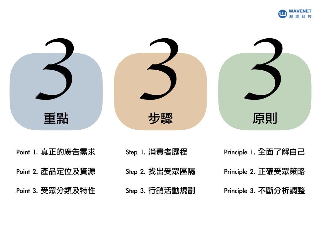從上述三大重點、三個步驟,我們可歸納出三大原則,使品牌能夠有效突破廣告成效的瓶頸: