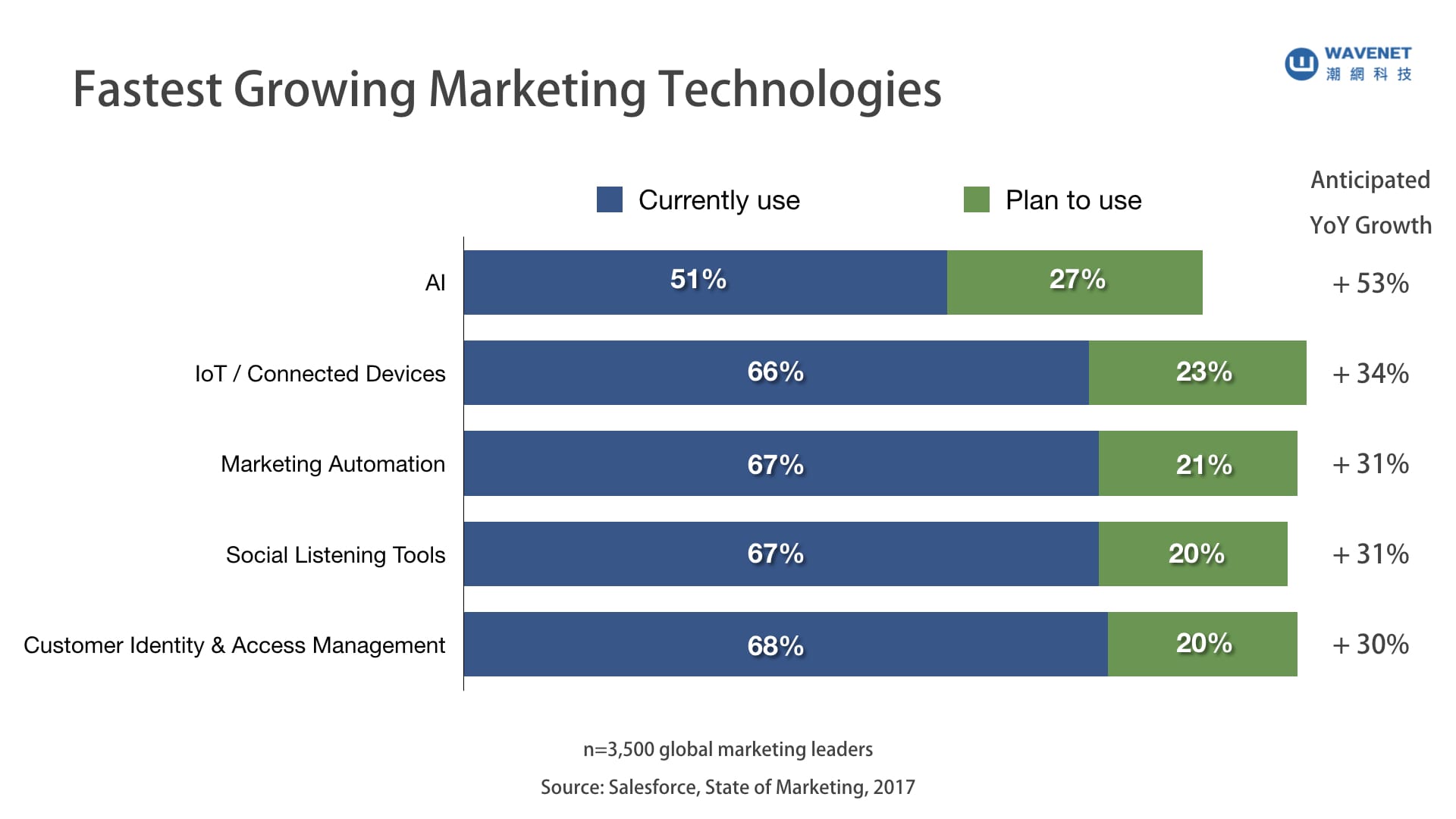 (行銷相關技術應用統計資料,其中 AI 採用程度的年成長高達 53%。資料來源:Salesforce 圖片來源:潮網科技)
