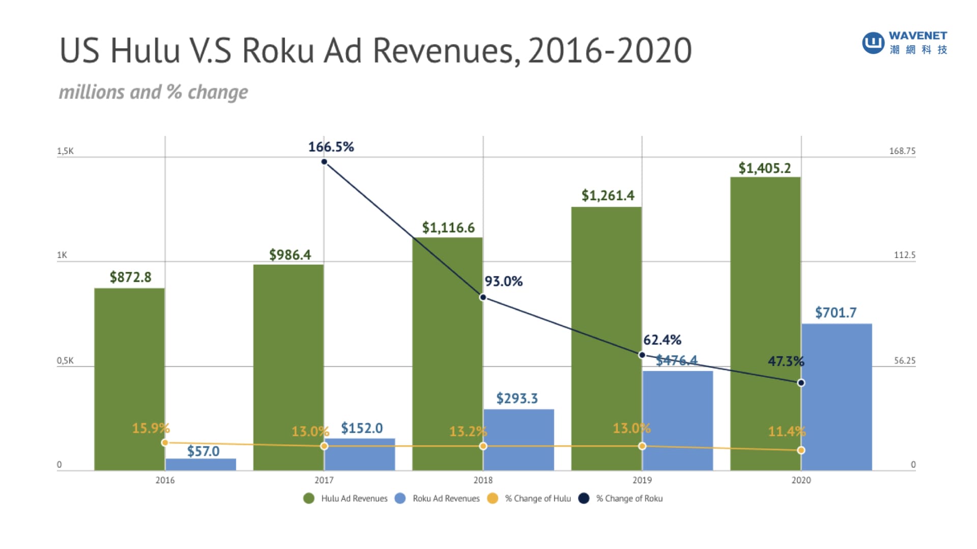 到2020年,Hulu在美國廣告淨收入將達到14億美元,高於2018年的 9.864億美元。在整個預測期內呈現兩位數的年增長率,其數據包括在Hulu的點播平台和直播電視服務上做廣告。雖然 Roku 廣告業務規模小於Hulu,但其預測增長曲線(成長率)甚至更高,2020年 Roku 淨美國廣告收入將達到 7.017億美元,高於 2018年的 2.93億美元。其廣告組合包括用戶啟動設備時出現的主畫面廣告、贊助及越來越多的插播影片廣告。