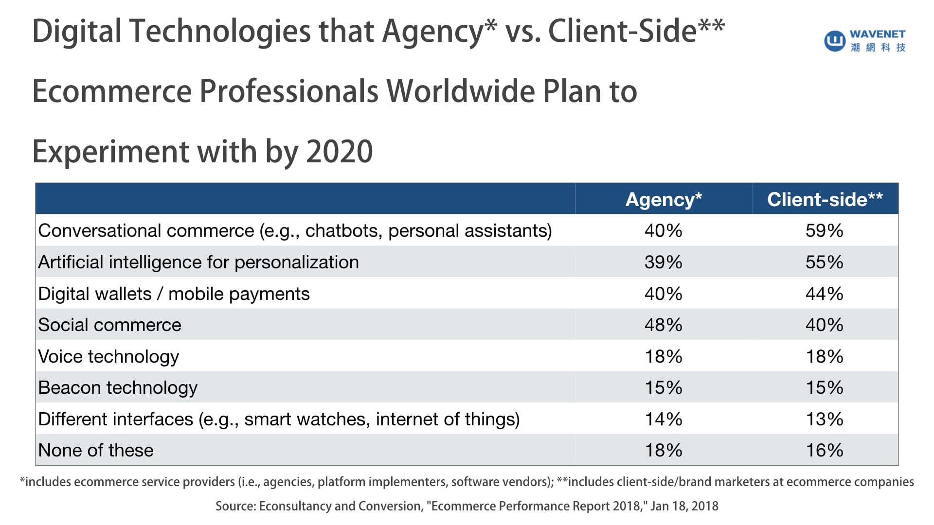(到2020年為止,個人語音助理與聊天機器人等對話式電子商務會是數位科技中被使用最多的技術及工具。數據來源:eMarketer 圖片來源:潮網科技)