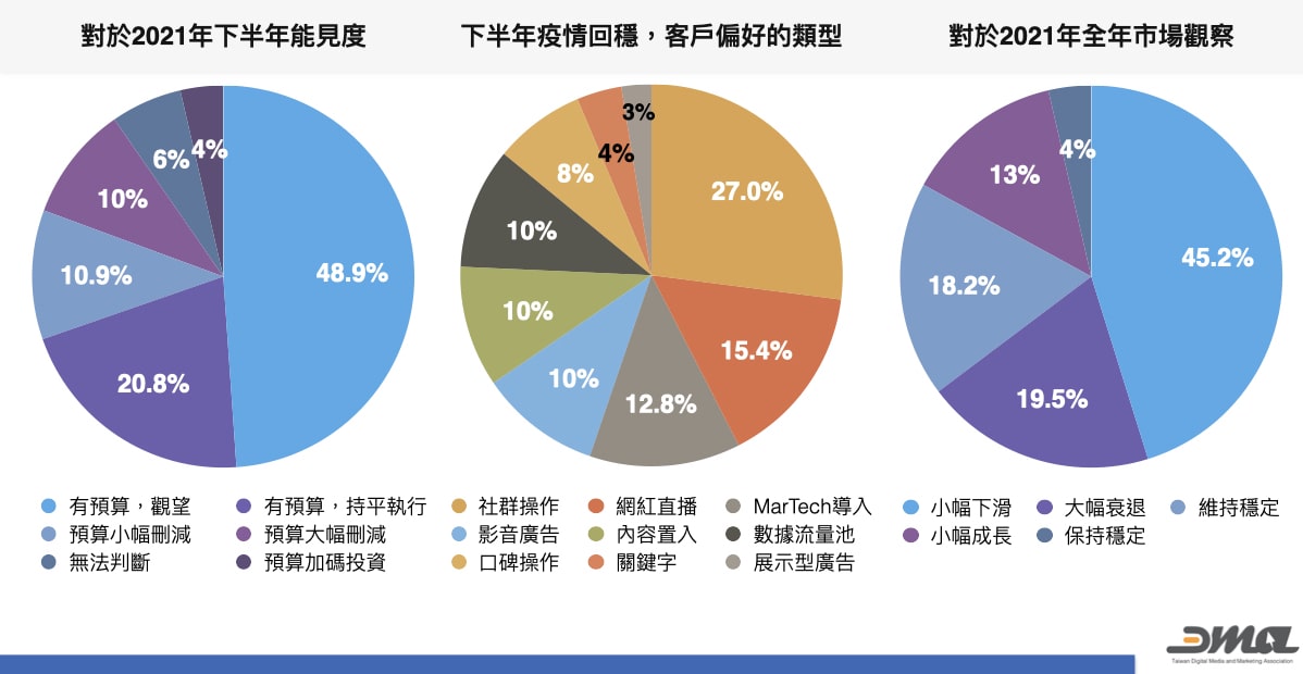 本次調查結果顯示,就產業面向,企業端仍有預算,但在疫情發展難以預測,疫苗政策不確定的狀況下,市場多以保守觀望態度面對。在投放部分,仍以電商、遊戲APP及醫療三大產業較積極。休閒娛樂、餐飲服務及時尚流行,則為困難產業。客戶端對於行銷投資態度謹慎保守,預期今年全年度數位行銷市場將呈現小幅下滑的狀況。